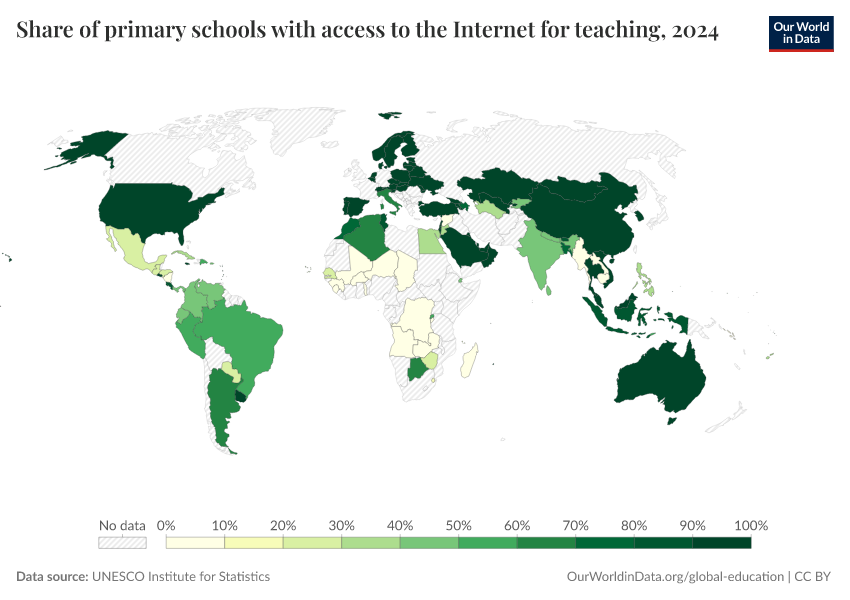 “Data Page: Share of primary schools with access to the Internet for teaching”. Our World in Data (2026). Data adapted from UNESCO Institute for Statistics. Retrieved from https://update-wdi-2026-02-27.owid.pages.dev:8789/20260130-180113/grapher/primary-schools-with-access-to-internet.html [online resource] (archived on January 30, 2026).How to cite this data
