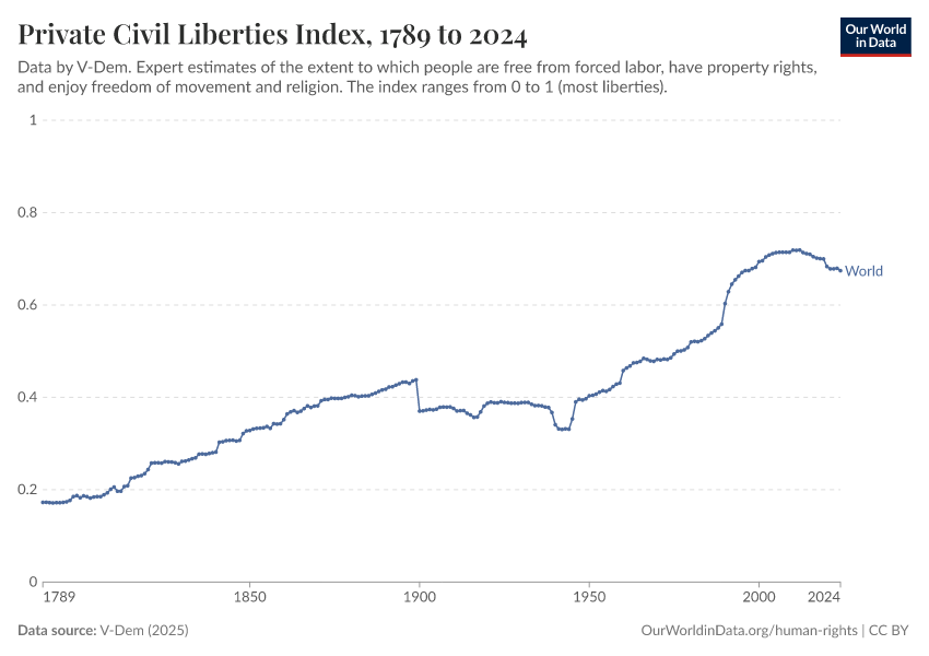 V-Dem (2025) – processed by Our World in Data. “Private civil liberties index – V-Dem” [dataset]. V-Dem, “Democracy report v15” [original data]. Retrieved March 1, 2026 from https://update-wdi-2026-02-27.owid.pages.dev:8789/20260119-070102/grapher/private-civil-liberties-index.html (archived on January 19, 2026).