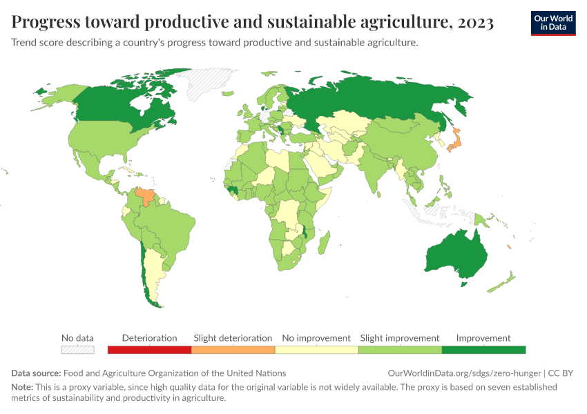 “Data Page: Progress toward productive and sustainable agriculture”. Our World in Data (2026). Data adapted from Food and Agriculture Organization of the United Nations. Retrieved from https://update-wdi-2026-02-27.owid.pages.dev:8789/20260130-180113/grapher/progress-toward-productive-and-sustainable-agriculture.html [online resource] (archived on January 30, 2026).How to cite this data