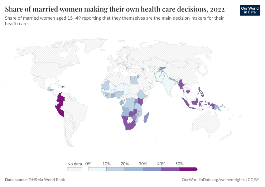 DHS via World Bank – processed by Our World in Data. “Share of married women making their own health care decisions” [dataset]. World Bank Gender Statistics, “World Bank Gender Statistics” [original data]. Retrieved March 1, 2026 from https://update-wdi-2026-02-27.owid.pages.dev:8789/20250916-204433/grapher/proportion-of-women-who-make-their-own-informed-health-care-decisions.html (archived on September 16, 2025).