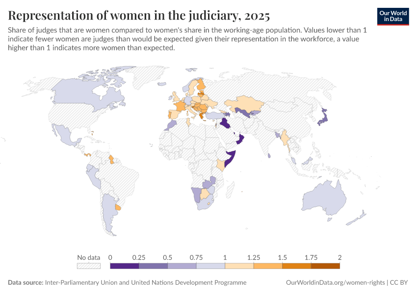 “Data Page: Representation of women in the judiciary”. Our World in Data (2026). Data adapted from Inter-Parliamentary Union and United Nations Development Programme. Retrieved from https://update-wdi-2026-02-27.owid.pages.dev:8789/20260105-133053/grapher/representation-of-women-in-the-judiciary.html [online resource] (archived on January 5, 2026).How to cite this data