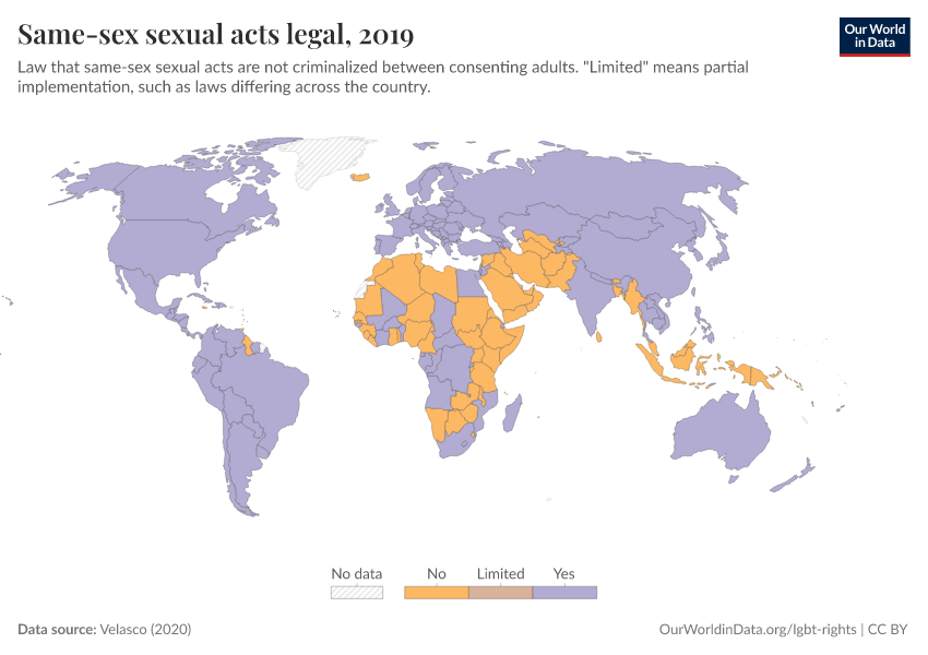 “Data Page: Same-sex sexual acts legal”, part of the following publication: Bastian Herre and Pablo Arriagada (2023) - “LGBT+ Rights”. Data adapted from Velasco. Retrieved from https://update-wdi-2026-02-27.owid.pages.dev:8789/20251023-195030/grapher/same-sex-sexual-acts-legal.html [online resource] (archived on October 23, 2025).How to cite this data