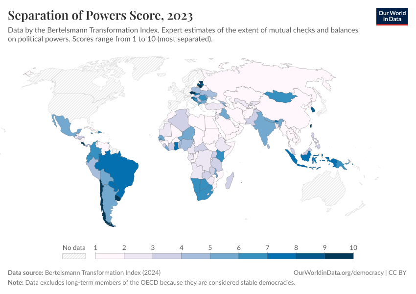 Bertelsmann Transformation Index (2024) – processed by Our World in Data. “Separation of Powers Score” [dataset]. Bertelsmann Transformation Index, “Bertelsmann Transformation Index, Scores” [original data]. Retrieved March 1, 2026 from https://update-wdi-2026-02-27.owid.pages.dev:8789/20260204-165456/grapher/separation-of-powers-score-bti.html (archived on February 4, 2026).