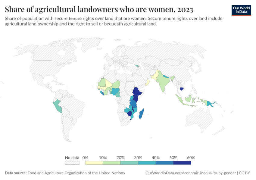 “Data Page: Share of agricultural landowners who are women”. Our World in Data (2026). Data adapted from Food and Agriculture Organization of the United Nations. Retrieved from https://update-wdi-2026-02-27.owid.pages.dev:8789/20260105-133053/grapher/share-of-agricultural-land-owners-that-are-women.html [online resource] (archived on January 5, 2026).How to cite this data