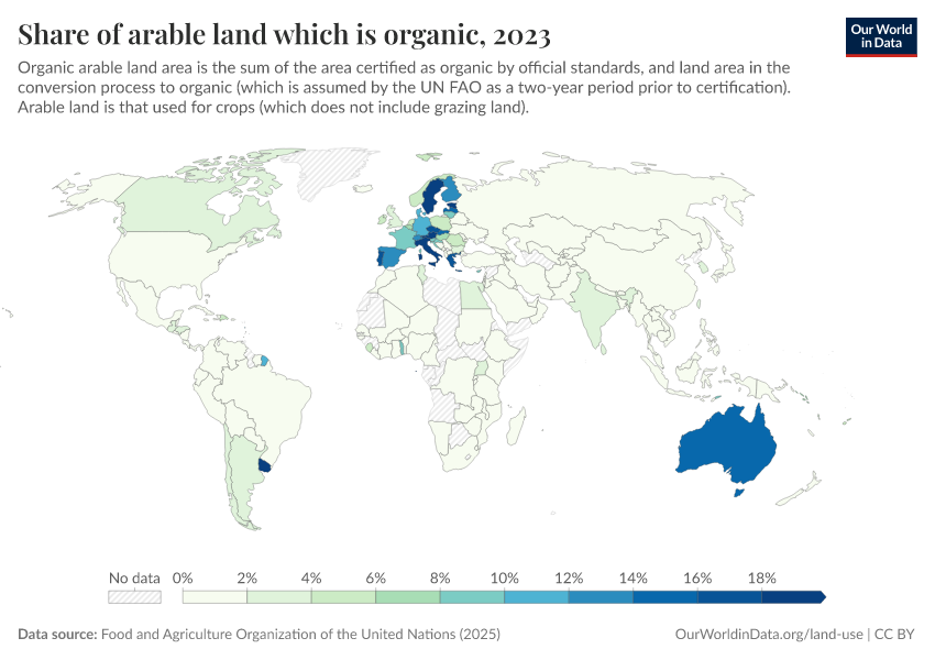 Food and Agriculture Organization of the United Nations (2025) – with major processing by Our World in Data. “Share of arable land that is organic – UN FAO” [dataset]. Food and Agriculture Organization of the United Nations, “Land, Inputs and Sustainability: Land Use” [original data]. Retrieved March 1, 2026 from https://update-wdi-2026-02-27.owid.pages.dev:8789/20260226-122020/grapher/share-of-arable-land-which-is-organic.html (archived on February 26, 2026).