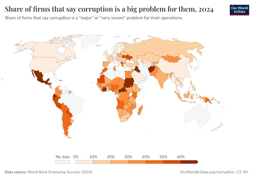 World Bank Enterprise Surveys (2024) – with minor processing by Our World in Data. “Share of firms that say corruption is a big problem for them” [dataset]. World Bank Enterprise Surveys, “Enterprise Surveys - Corruption” [original data]. Retrieved March 1, 2026 from https://update-wdi-2026-02-27.owid.pages.dev:8789/20251209-133038/grapher/share-of-firms-that-say-corruption-is-a-big-problem-for-them.html (archived on December 9, 2025).