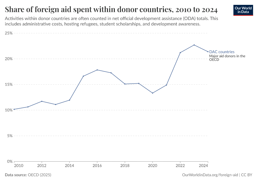 OECD (2025) – with minor processing by Our World in Data. “Share of foreign aid spent within donor countries – Net disbursements” [dataset]. OECD, “OECD Official Development Assistance (ODA) - DAC1: Flows by provider (ODA+OOF+Private)” [original data]. Retrieved March 1, 2026 from https://update-wdi-2026-02-27.owid.pages.dev:8789/20251230-141326/grapher/share-of-foreign-aid-spent-within-donor-countries.html (archived on December 30, 2025).