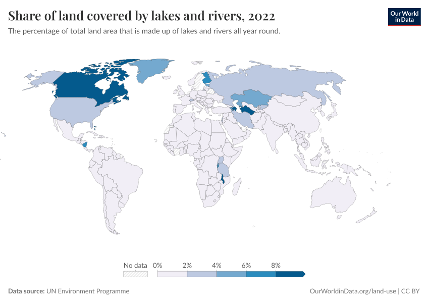 “Data Page: Share of land covered by lakes and rivers”. Our World in Data (2026). Data adapted from UN Environment Programme. Retrieved from https://update-wdi-2026-02-27.owid.pages.dev:8789/20260130-180113/grapher/share-of-land-covered-by-lakes-and-rivers.html [online resource] (archived on January 30, 2026).How to cite this data