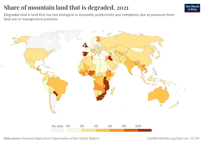 “Data Page: Share of mountain land that is degraded”. Our World in Data (2026). Data adapted from Food and Agriculture Organization of the United Nations. Retrieved from https://update-wdi-2026-02-27.owid.pages.dev:8789/20260130-180113/grapher/share-of-mountain-land-that-is-degraded.html [online resource] (archived on January 30, 2026).How to cite this data