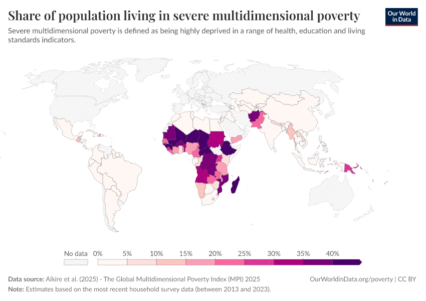 “Data Page: Share of population living in severe multidimensional poverty”, part of the following publication: Joe Hasell, Bertha Rohenkohl, Pablo Arriagada, Esteban Ortiz-Ospina, and Max Roser (2022) - “Poverty”. Data adapted from Alkire et al.. Retrieved from https://update-wdi-2026-02-27.owid.pages.dev:8789/20251229-175603/grapher/share-of-population-in-severe-multidimensional-poverty.html [online resource] (archived on December 29, 2025).How to cite this data