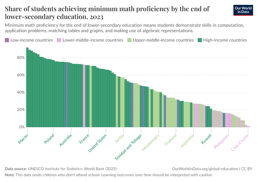 “Data Page: Share of students achieving minimum math proficiency by the end of lower-secondary education”. Our World in Data (2026). Data adapted from UNESCO Institute for Statistics. Retrieved from https://update-wdi-2026-02-27.owid.pages.dev:8789/20260130-180113/grapher/share-of-students-at-end-of-lower-secondary-education-achieving-minimum-math-proficiency.html [online resource] (archived on January 30, 2026).How to cite this data