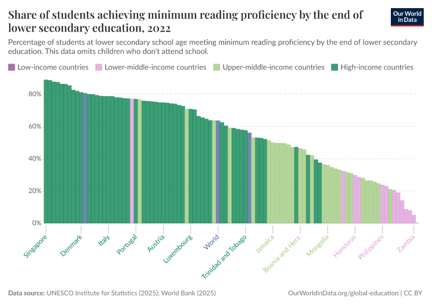 UNESCO Institute for Statistics (2025) – with minor processing by Our World in Data. “Share of students achieving minimum reading proficiency by the end of lower secondary education” [dataset]. UNESCO Institute for Statistics, “UNESCO Institute for Statistics (UIS) - Education” [original data]. Retrieved March 1, 2026 from https://update-wdi-2026-02-27.owid.pages.dev:8789/20260122-091445/grapher/share-of-students-at-end-of-lower-secondary-education-with-minimum-reading-proficiency.html (archived on January 22, 2026).