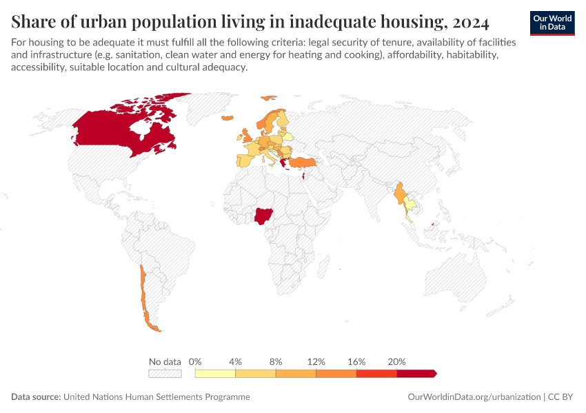United Nations Human Settlements Programme – processed by Our World in Data. “Share of urban population living in inadequate housing” [dataset]. United Nations Human Settlements Programme, “Data from multiple sources” [original data]. Retrieved March 1, 2026 from https://update-wdi-2026-02-27.owid.pages.dev:8789/20251120-211749/grapher/share-of-urban-population-living-in-inadequate-housing.html (archived on November 20, 2025).
