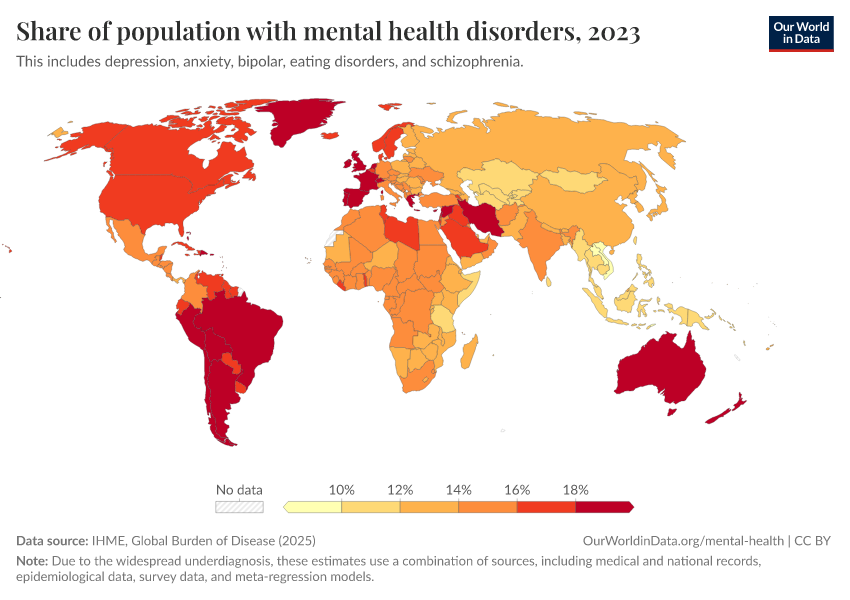 IHME, Global Burden of Disease (2025) – with major processing by Our World in Data. “Share of population with mental health disorders” [dataset]. IHME, Global Burden of Disease, “Global Burden of Disease - Prevalence and Incidence” [original data]. Retrieved March 1, 2026 from https://update-wdi-2026-02-27.owid.pages.dev:8789/20260212-172132/grapher/share-with-mental-and-substance-disorders.html (archived on February 12, 2026).