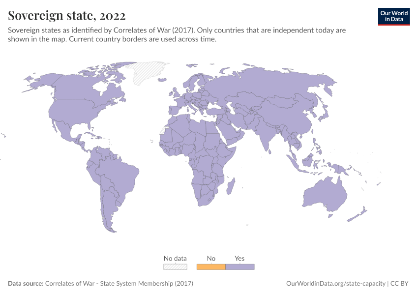 “Data Page: Sovereign state”, part of the following publication: Bastian Herre and Pablo Arriagada (2023) - “State Capacity”. Data adapted from Correlates of War. Retrieved from https://update-wdi-2026-02-27.owid.pages.dev:8789/20260224-080822/grapher/sovereign-state-cow.html [online resource] (archived on February 24, 2026).How to cite this data