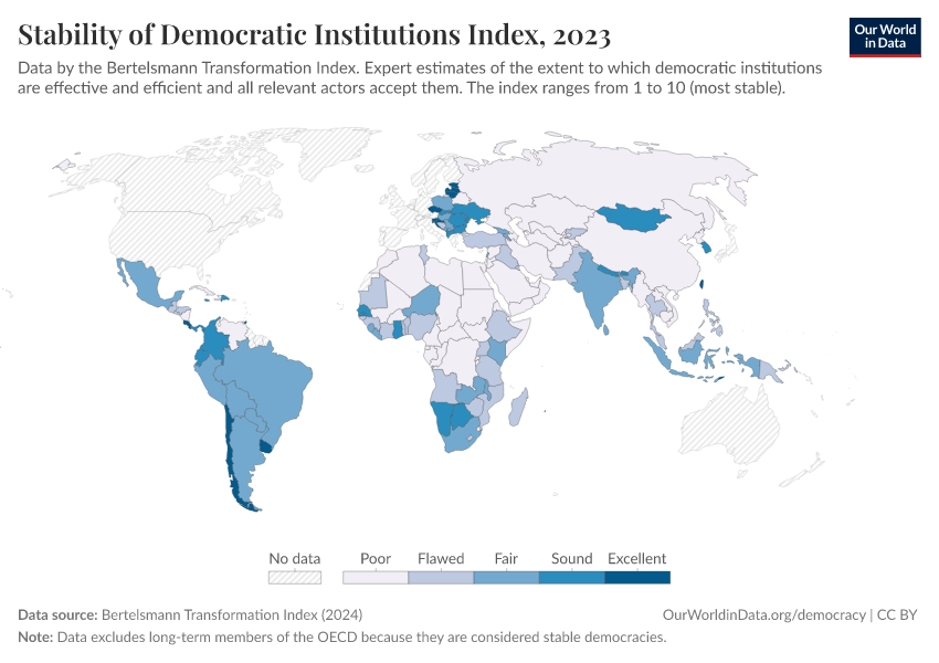 “Data Page: Stability of Democratic Institutions Index”, part of the following publication: Bastian Herre, Lucas Rodés-Guirao, and Esteban Ortiz-Ospina (2013) - “Democracy”. Data adapted from Bertelsmann Transformation Index. Retrieved from https://update-wdi-2026-02-27.owid.pages.dev:8789/20260105-133053/grapher/stability-democratic-institutions-index-bti.html [online resource] (archived on January 5, 2026).How to cite this data