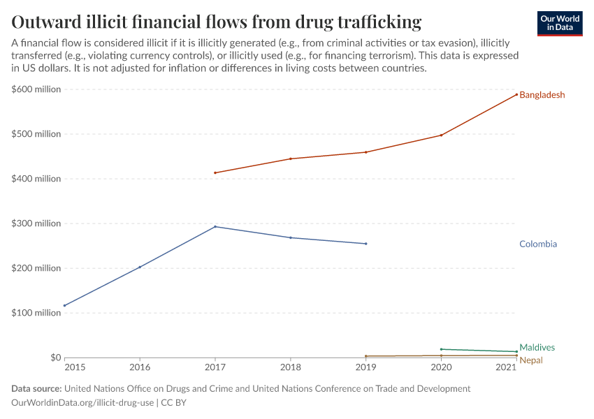 “Data Page: Outward illicit financial flows from drug trafficking”. Our World in Data (2026). Data adapted from United Nations Office on Drugs and Crime and United Nations Conference on Trade and Development. Retrieved from https://update-wdi-2026-02-27.owid.pages.dev:8789/20251120-211749/grapher/total-outward-financial-flows-from-drug-trafficking.html [online resource] (archived on November 20, 2025).How to cite this data