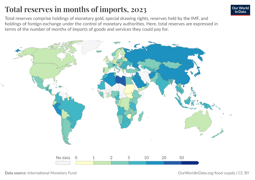 “Data Page: Total reserves in months of imports”. Our World in Data (2026). Data adapted from International Monetary Fund. Retrieved from https://update-wdi-2026-02-27.owid.pages.dev:8789/20260130-180113/grapher/total-reserves-in-months-of-imports.html [online resource] (archived on January 30, 2026).How to cite this data