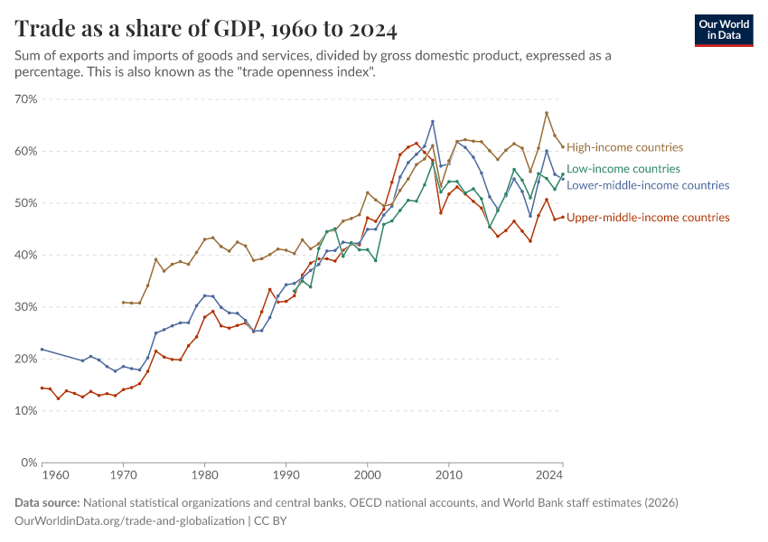National statistical organizations and central banks, OECD national accounts, and World Bank staff estimates (2026) – processed by Our World in Data. “Trade as a share of GDP” [dataset]. National statistical organizations and central banks, OECD national accounts, and World Bank staff estimates, “World Development Indicators 125” [original data]. Retrieved March 1, 2026 from https://update-wdi-2026-02-27.owid.pages.dev:8789/20260225-205642/grapher/trade-as-share-of-gdp.html (archived on February 25, 2026).