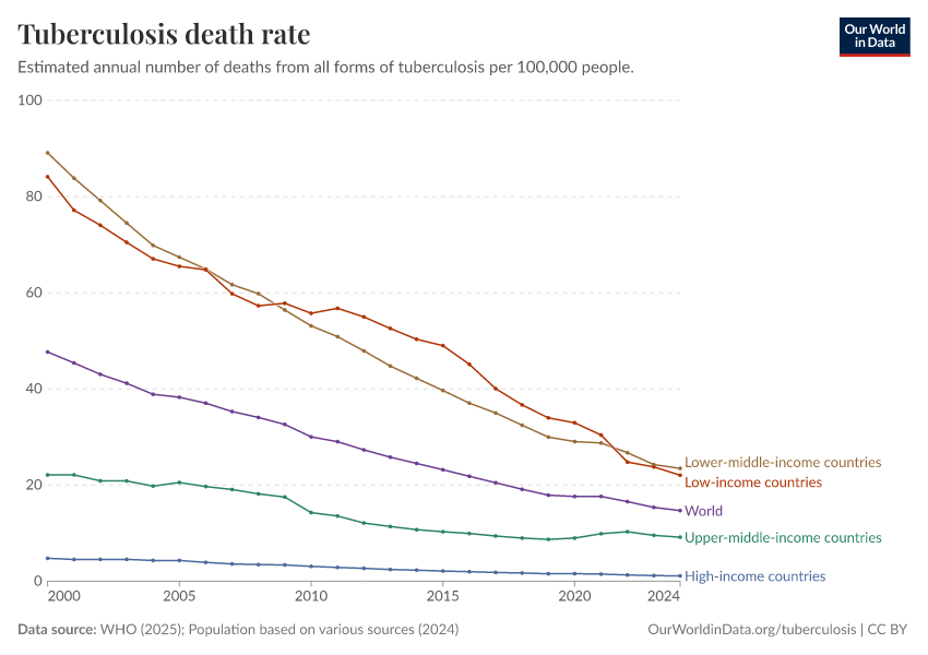 “Data Page: Tuberculosis death rate”, part of the following publication: Saloni Dattani, Fiona Spooner, Hannah Ritchie, and Max Roser (2023) - “Tuberculosis”. Data adapted from WHO, Various sources. Retrieved from https://update-wdi-2026-02-27.owid.pages.dev:8789/20260205-170810/grapher/tuberculosis-death-rate.html [online resource] (archived on February 5, 2026).How to cite this data