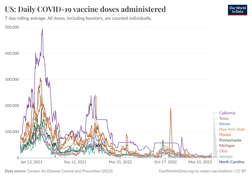 Centers for Disease Control and Prevention (2023) – processed by Our World in Data. “US: Daily COVID-19 vaccine doses administered” [dataset]. Centers for Disease Control and Prevention, “COVID-19, Vaccinations (United States)” [original data]. Retrieved March 1, 2026 from https://update-wdi-2026-02-27.owid.pages.dev:8789/20250909-093708/grapher/us-daily-covid-vaccine-doses-administered.html (archived on September 9, 2025).