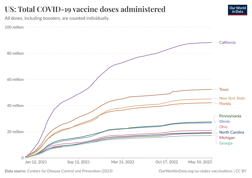 Centers for Disease Control and Prevention (2023) – processed by Our World in Data. “US: Total COVID-19 vaccine doses administered” [dataset]. Centers for Disease Control and Prevention, “COVID-19, Vaccinations (United States)” [original data]. Retrieved March 1, 2026 from https://update-wdi-2026-02-27.owid.pages.dev:8789/20250909-093708/grapher/us-total-covid-19-vaccine-doses-administered.html (archived on September 9, 2025).