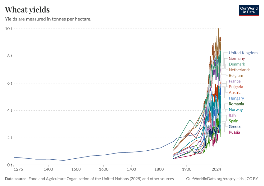 Food and Agriculture Organization of the United Nations (2025); Broadberry et al. (2015); Brassley (2000); Bayliss-Smith & Wanmali (1984) – with major processing by Our World in Data. “Wheat yields” [dataset]. Food and Agriculture Organization of the United Nations, “Production: Crops and livestock products”; Broadberry et al., “Long-term crop yields in UK”; Brassley, “Long-term crop yields in UK”; Bayliss-Smith & Wanmali, “Understanding Green Revolutions” [original data]. Retrieved March 1, 2026 from https://update-wdi-2026-02-27.owid.pages.dev:8789/20260116-143329/grapher/wheat-yields.html (archived on January 16, 2026).