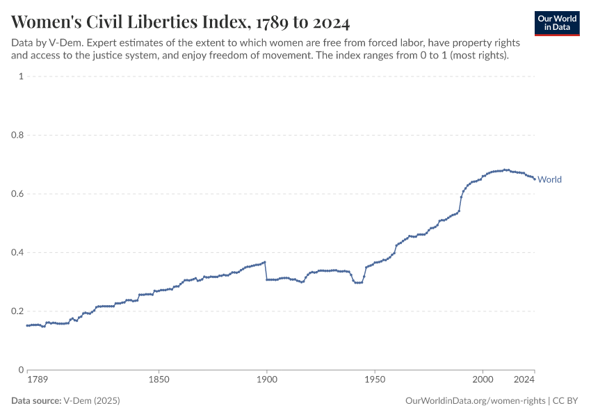 V-Dem (2025) – processed by Our World in Data. “Women's civil rights index – V-Dem” [dataset]. V-Dem, “Democracy report v15” [original data]. Retrieved March 1, 2026 from https://update-wdi-2026-02-27.owid.pages.dev:8789/20260119-070102/grapher/women-civil-liberties-index.html (archived on January 19, 2026).