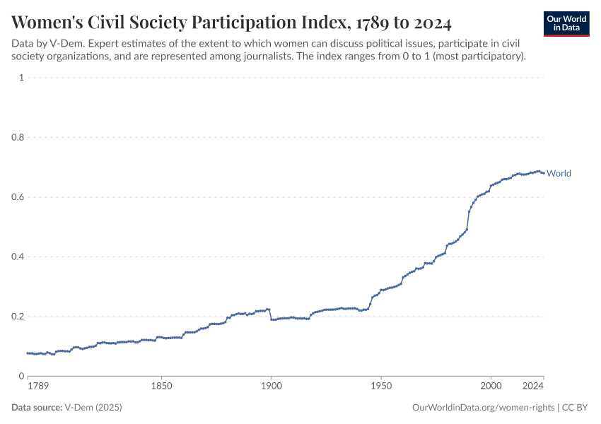 “Data Page: Women's civil society participation index”, part of the following publication: Bastian Herre, Lucas Rodés-Guirao, and Esteban Ortiz-Ospina (2013) - “Democracy”. Data adapted from V-Dem. Retrieved from https://update-wdi-2026-02-27.owid.pages.dev:8789/20260119-070102/grapher/women-civil-society-participation-index.html [online resource] (archived on January 19, 2026).