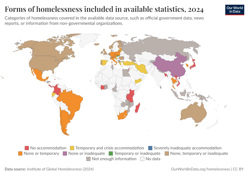 The map shows the forms of homelessness included in country statistics, as recorded by the Institute of Global Homelessness.