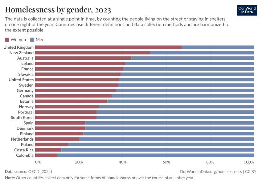 In the United Kingdom and New Zealand, it’s even the opposite: more women experience homelessness than men.