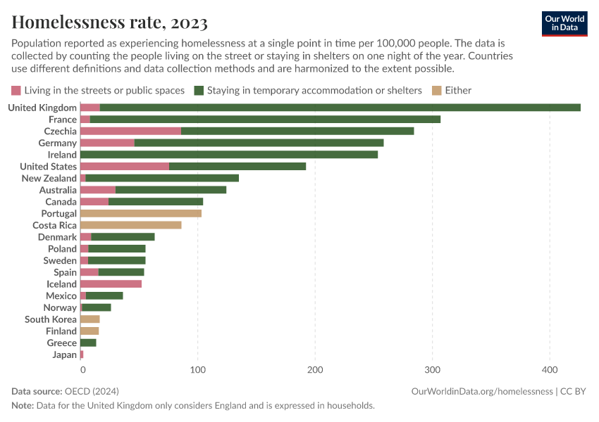 There are also differences in types of homelessness. The United States, for example, has relatively high numbers of people living in the streets or public spaces but fewer in temporary accommodations or shelters.