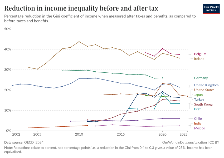 Joe Hasell (2023) - “Income inequality before and after taxes: how much do countries redistribute income?” Published online at OurWorldinData.org. Retrieved from: 'https://update-wdi-2026-02-27.owid.pages.dev:8789/20260119-065148/income-inequality-before-and-after-taxes.html' [Online Resource] (archived on January 19, 2026).BibTeX citation