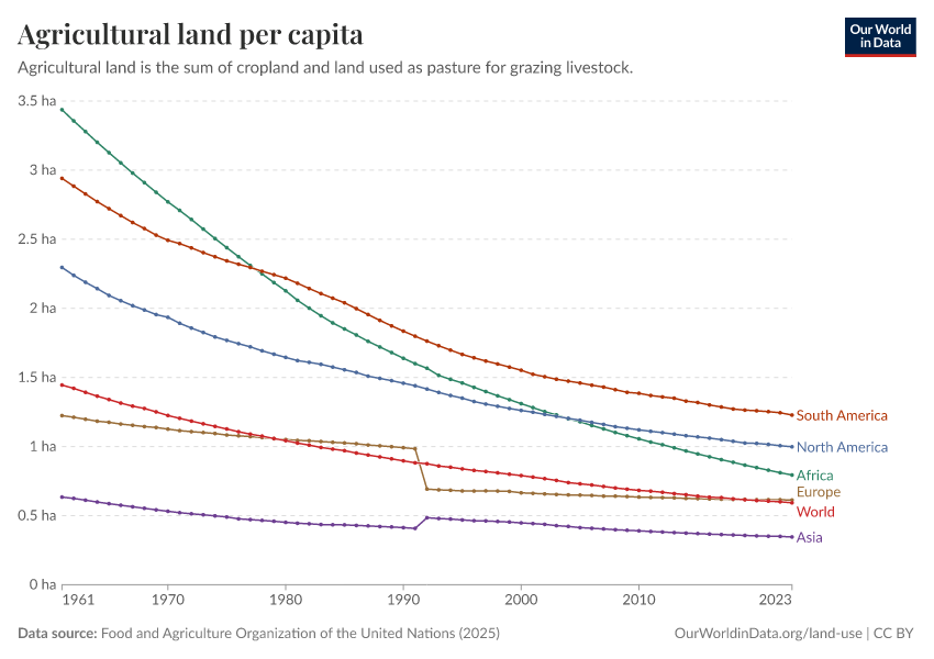 Africa, in particular, has seen dramatic reductions in agricultural land per person – it is now less than one-third of the value it was in the 1960s. The Americas (North and South) and Africa have notably higher per capita agricultural land use relative to Europe and Asia.