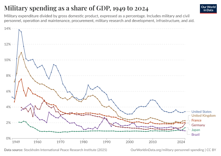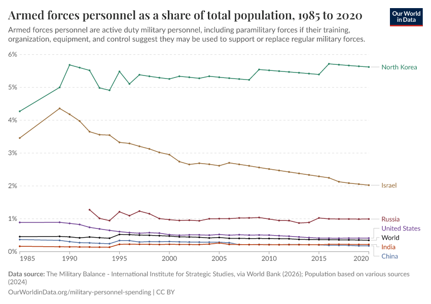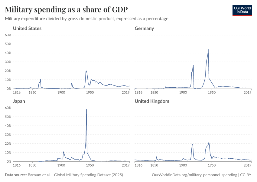 Esteban Ortiz-Ospina (2018) - “Long-run trends in military spending and personnel: four key facts from new data” Published online at OurWorldinData.org. Retrieved from: 'https://update-wdi-2026-02-27.owid.pages.dev:8789/20260202-181317/military-long-run-spending-perspective.html' [Online Resource] (archived on February 2, 2026).BibTeX citation