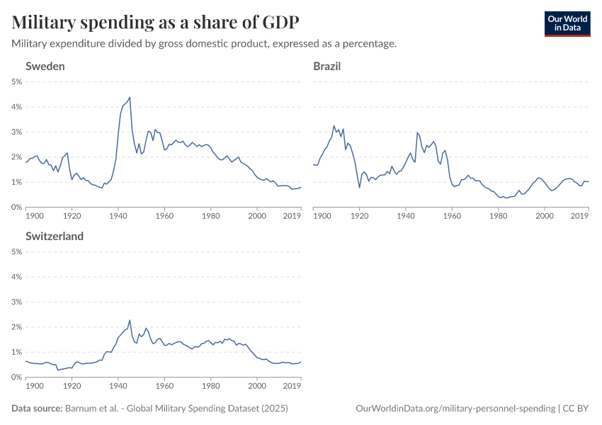 How much do countries spend on the military in the absence of major violent conflict? The chart shown here focuses on Sweden, Brazil and Switzerland. As we can see, despite broad reductions in recent years, all these countries have kept levels of military spending close to 1% of GDP. In all these countries the level today is similar to what it was at the turn of the 20th century.