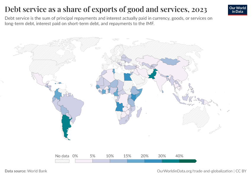 Total debt service is the sum of principal repayments and interest actually paid in currency, goods, or services on long-term debt, interest paid on short-term debt, and repayments (repurchases and charges) to the IMF. This indicator measures total debt service as a share of a country’s exports of goods and services.