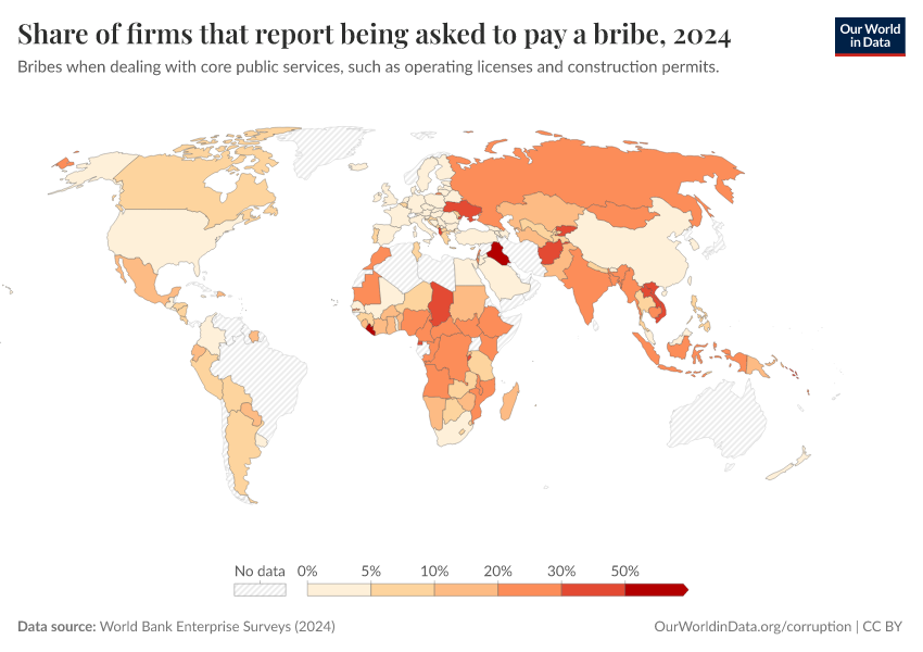The indicator is measured differently, as the share of firms experiencing at least one bribe payment request across 6 public transactions dealing with utilities access, permits, licences, and taxes.