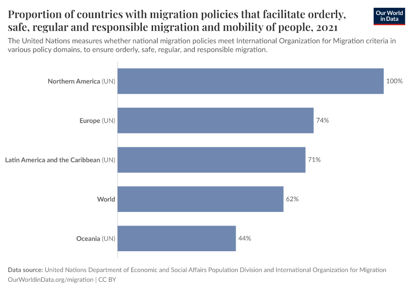 Although this indicator is defined in terms of the number of countries, the United Nations measures this indicator in terms of the extent to which country migration policies meet International Organization for Migration (IOM) criteria in a variety of policy domains. These criteria are based on the principles of the IOM’s Migration Governance Framework, which seeks to promote well-managed migration that is beneficial to all.