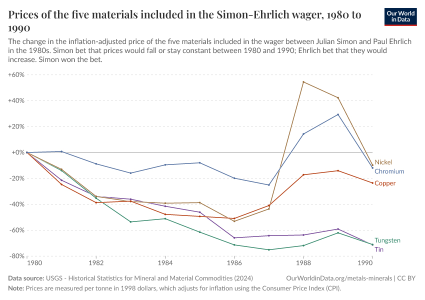 Hannah Ritchie (2025) - “Who would have won the Simon-Ehrlich bet over different decades, and what do long-term prices tell us about resource scarcity?” Published online at OurWorldinData.org. Retrieved from: 'https://update-wdi-2026-02-27.owid.pages.dev:8789/20251217-135836/simon-ehrlich-bet.html' [Online Resource] (archived on December 17, 2025).BibTeX citation