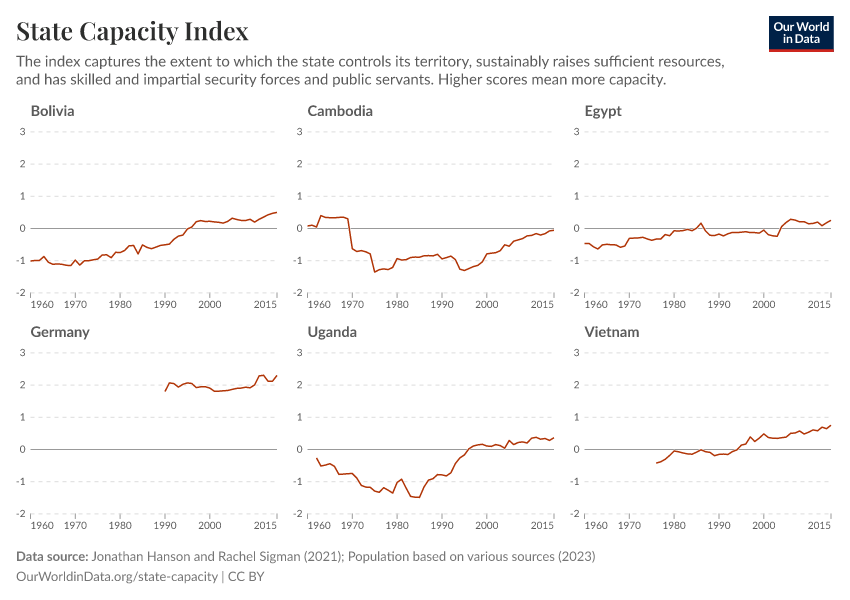 Bastian Herre and Pablo Arriagada (2023) - “State Capacity” Published online at OurWorldinData.org. Retrieved from: 'https://update-wdi-2026-02-27.owid.pages.dev/state-capacity' [Online Resource]BibTeX citation