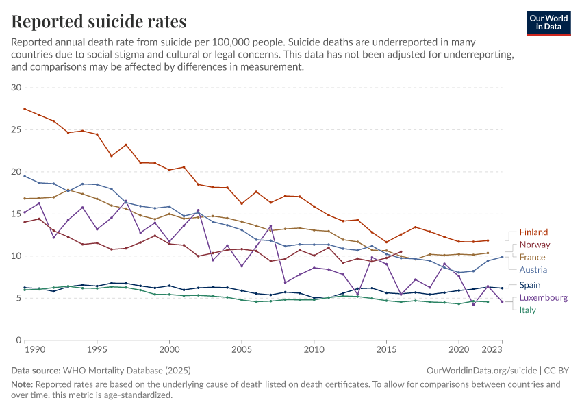 Saloni Dattani, Lucas Rodés-Guirao, Hannah Ritchie, Max Roser, and Esteban Ortiz-Ospina (2023) - “Suicides” Published online at OurWorldinData.org. Retrieved from: 'https://update-wdi-2026-02-27.owid.pages.dev/suicide' [Online Resource]BibTeX citation