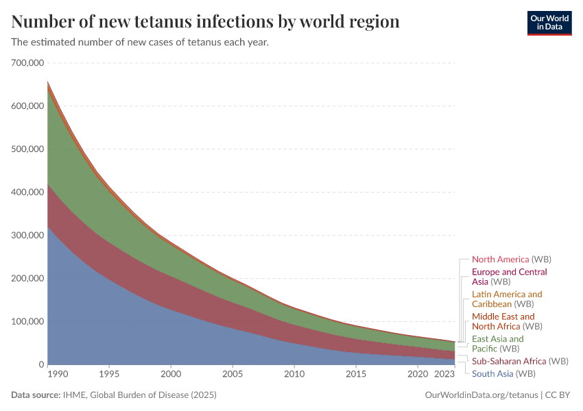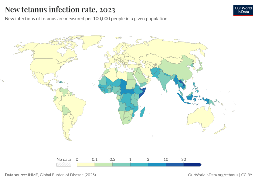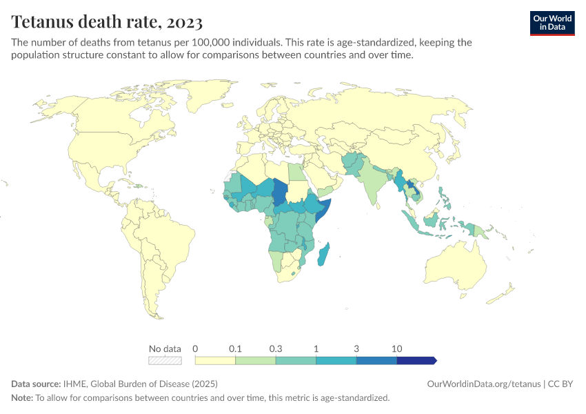 Hannah Behrens, Sophie Ochmann, Bernadeta Dadonaite, and Max Roser (2019) - “Tetanus” Published online at OurWorldinData.org. Retrieved from: 'https://update-wdi-2026-02-27.owid.pages.dev/tetanus' [Online Resource]BibTeX citation