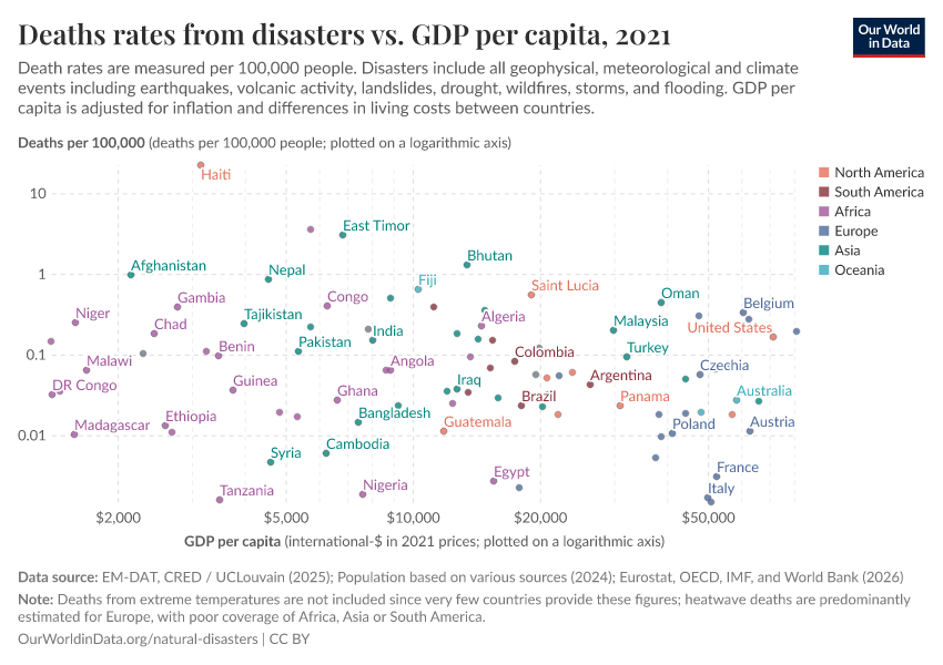 Hannah Ritchie (2024) - “The world has become more resilient to disasters, but investment is needed to save more lives” Published online at OurWorldinData.org. Retrieved from: 'https://update-wdi-2026-02-27.owid.pages.dev:8789/20260202-181317/the-world-has-become-more-resilient-to-disasters-but-investment-is-needed-to-save-more-lives.html' [Online Resource] (archived on February 2, 2026).BibTeX citation
