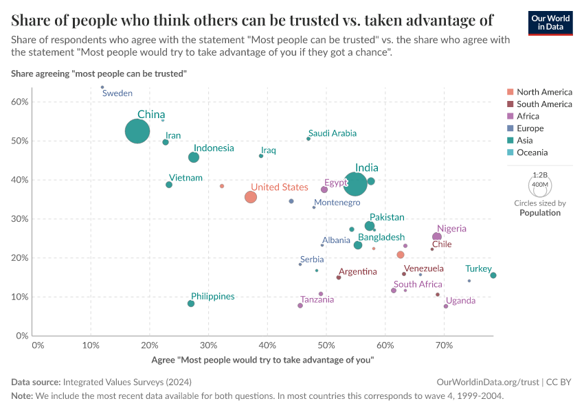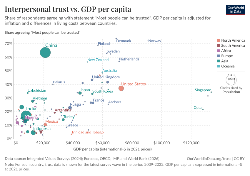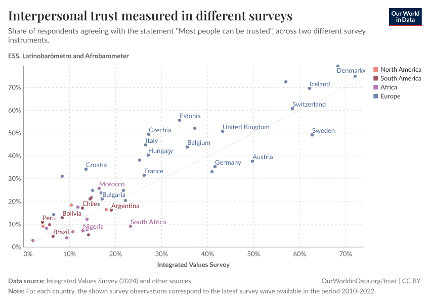 Esteban Ortiz-Ospina, Max Roser, and Pablo Arriagada (2016) - “Trust” Published online at OurWorldinData.org. Retrieved from: 'https://update-wdi-2026-02-27.owid.pages.dev/trust' [Online Resource]BibTeX citation