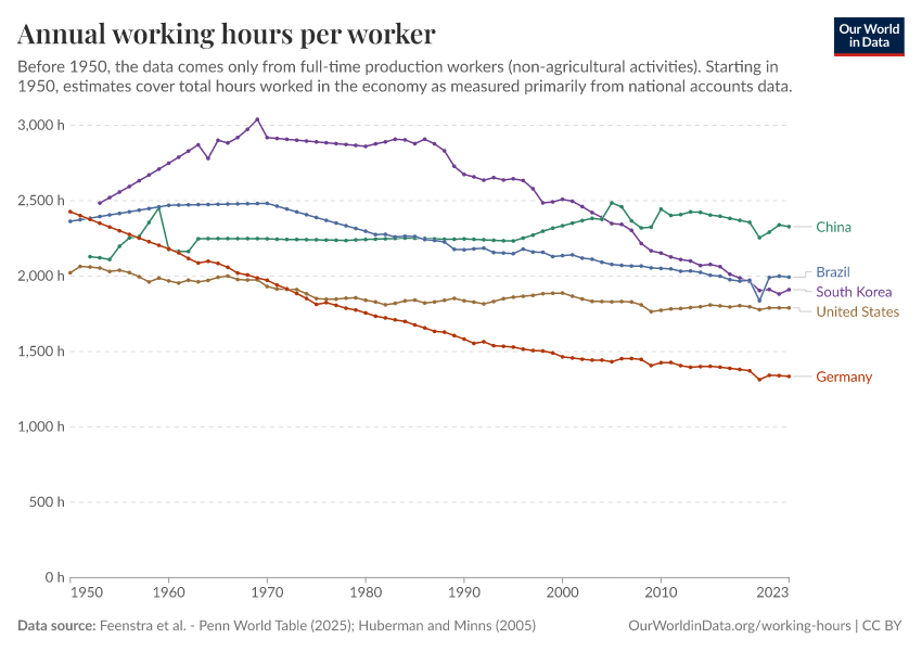 The chart here shows average working hours since 1870 for a selection of countries that industrialized early. You can add or remove countries by clicking ‘Edit countries and regions’ on the chart.